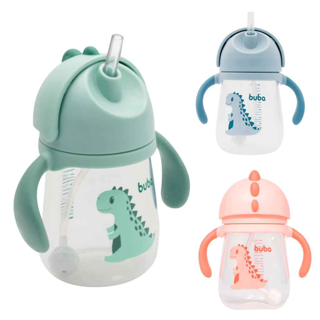 Copo Bebê Infantil Dino Alça Removível Canudo Silicone Buba.